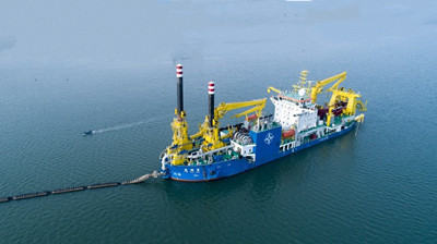 船首前端橋梁放到水面以下。通過橋架前端絞刀的旋轉(zhuǎn)將水下泥面挖松,并通過泥泵機所產(chǎn)生的負壓吸力把泥沙從水下抽出,并吹送到上千米乃至上萬米外的指定區(qū)域。達到疏浚航道和圍海造地的雙重目的。